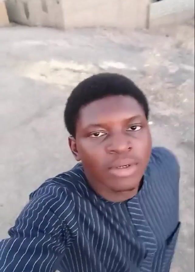A young, dark-skinned man with short, dark hair stands outside. He is wearing a long-sleeved, navy blue shirt with thin white stripes. He is looking directly at the camera, which he is holding. He breathes heavily and the camera shakes slightly. Behind him are low, beige-colored buildings of various sizes and heights. Beyond the buildings, a few trees and hills are visible in the distance. The sky is pale, possibly indicating dusk or dawn.