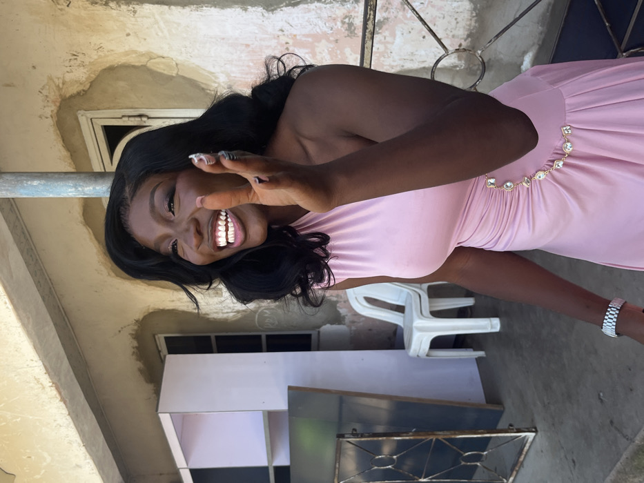An adult female, positioned in an outdoor setting in Jos, Nigeria, is captured from the waist up. She has a dark complexion, long dark wavy hair, and is wearing a one-shoulder pink dress featuring a decorative chain of clear, faceted stones along a ruched section on her right side. A silver-colored wristwatch is present on her left wrist. She is smiling broadly, exposing her teeth, and her left hand is raised in a gesturing motion, with fingers slightly curled and nails manicured with dark polish and white patterns. She appears to be looking towards the right of the frame. The background features a light-colored, rough concrete wall of a building. A light-colored vertical pole stands behind her. To the left of the frame, a white plastic monobloc chair, two open-shelved white storage units, and a dark rectangular panel are visible. A dark-framed door or window is partially obscured in the center-right background. The ground is a light-colored concrete surface. The scene is brightly lit by natural daylight.