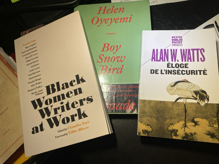Three books are arranged on a dark surface. "Black Women Writers at Work," edited by Claudia Tate, lists notable authors Maya Angelou, Toni Cade Bambara, Gwendolyn Brooks, and others. Next is "Boy, Snow, Bird" by Helen Oyeyemi. To the right, is "Éloge de l'insécurité" by Alan W. Watts, featuring a crane illustration. A partial book is visible on the left, possibly Proust, with "Paris" visible on its spine.