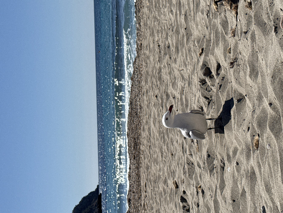 The image depicts a beach scene at the city of Andratx, Spain, under a clear, bright blue sky. A solitary seagull, primarily white with light grey wing markings and a prominent red beak, stands centered on the foreground's light-colored sand. Its dark legs cast a short shadow directly beneath it. The sand exhibits ripple patterns and contains scattered natural debris, including dried seaweed and small fragments. Beyond the sand, the Mediterranean Sea extends, displaying varying shades of blue. Sunlight intensely reflects off the water's surface in the midground, creating numerous bright glints on the gentle waves breaking near the shore. In the far left background, a verdant, rocky headland or cliff juts into the sea. A small, orange-colored buoy is faintly visible floating on the water in the upper midground to the right. No human subjects are present.