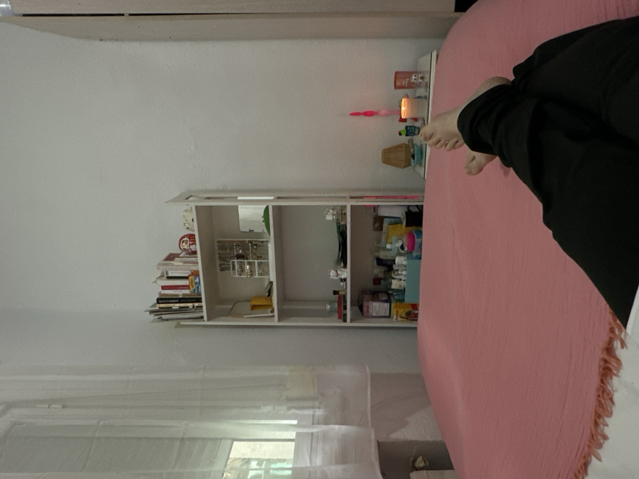 The image displays an interior view of a bedroom, located in Madrid, Spain, captured from the perspective of an individual lying on the bed. The lower legs and bare feet of a person, wearing dark trousers, are visible in the lower right foreground, resting on a pink, textured blanket that covers the bed. To the left, a window is partially visible, covered by sheer white curtains, revealing a portion of an exterior building and green foliage. Against the back wall, a white, four-shelf open bookshelf stands. The top shelf holds several books, a white ceramic Maneki-neko cat figurine, and a red Daruma doll. The second shelf contains more books, a silver-colored tiered jewelry stand displaying earrings and necklaces, and a small mirror with a green base. The third shelf features a white ceramic Maneki-neko cat and other small items. The bottom shelf is densely packed with various bottles, jars, and containers, including a light blue organizer, suggesting personal care products. To the right of the bookshelf, a small white nightstand is positioned. On its surface are a small wooden diffuser, a tall pink spiral-shaped object, a lit candle in a glass jar, and another white ceramic Maneki-neko cat figurine. The room's walls are painted white and exhibit a subtle texture. A vertical, light-colored panel, consistent with a door or wardrobe, is partially visible on the far right edge of the frame.