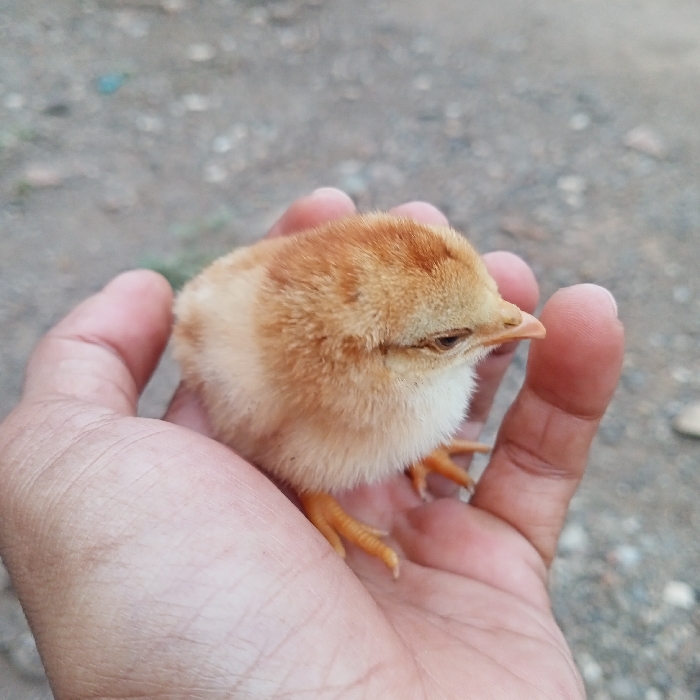 A human hand, displaying a medium-dark skin tone, gently cups a small chick in the city of Ketowan, Indonesia. The chick, primarily light brown to orange with some white plumage on its underside, is oriented with its head facing towards the right side of the frame, its small beak visible, and its eyes appearing partially closed. Its slender, orange-colored legs are extended downwards within the palm. The background consists of a blurred, gravelly dirt surface.