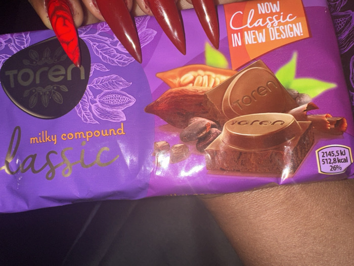 The image displays a close-up view of a purple-packaged "Toren classic milky compound" chocolate bar held or resting against an unseen surface