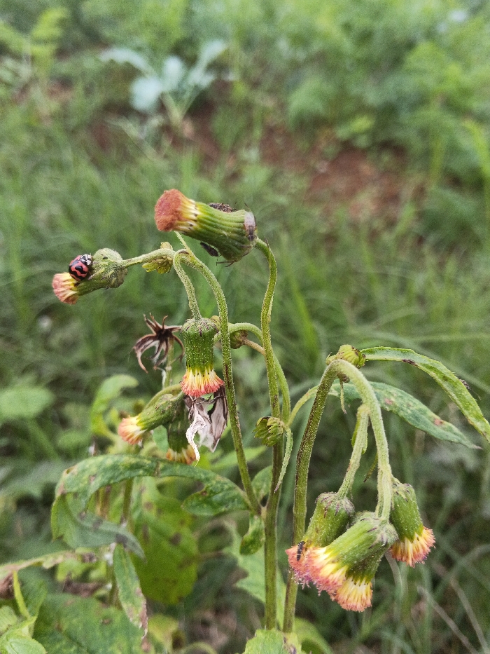 The image displays a close-up view of a flowering plant located in Pinnwe, Myanmar (Burma). The central subject is a herbaceous plant with multiple green stems and numerous flower heads in various stages of development. The flower buds are green, tapering upwards, with several partially opened blossoms revealing vibrant orange-red and yellow florets, some exhibiting white fibrous structures. Other flower heads appear desiccated or wilted. Essential details about the fauna include: * A single, distinct ladybug, characterized by a striped red and black pattern, is positioned on a developing flower bud in the upper left portion of the image. * Several small, dark ants are visible, with one prominent on a partially opened flower head in the lower right, and others on different buds and stems. * Multiple minute, dark insects are present on the green portions of the upper flower buds, consistent with small plant-feeding insects. The background consists of out-of-focus green foliage and patches of brown soil, suggesting an outdoor, natural, or uncultivated environment. No human subjects or man-made objects are visible.