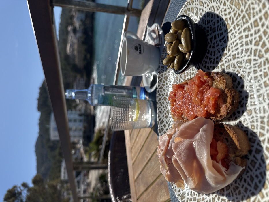 The image displays a meal set on a slatted wooden table on an outdoor terrace, overlooking a coastal scene in Andratx, Spain, under a clear blue sky