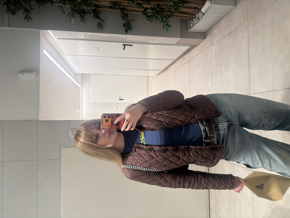 A woman takes a selfie in a bathroom mirror. She is wearing a brown quilted jacket, a dark blue shirt, and light blue jeans with a belt. She holds an orange phone with a patterned case and a tan bag with a teddy bear graphic on it. The bathroom features white tile floors and walls, with a green plant visible near the ceiling. There are also multiple white doors with black handles visible in the mirror.