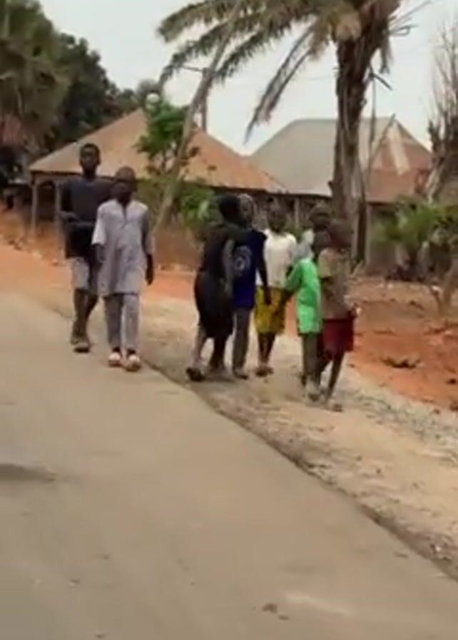 The video depicts a group of people walking along a paved road in what appears to be a rural or semi-rural setting