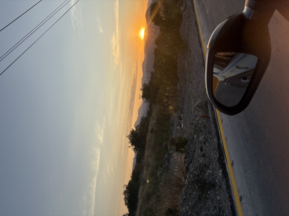 The image depicts a scenic view at sunset. Silhouetted mountains are visible in the distance, with the sun setting behind them. In the foreground, there's a roadside with sparse vegetation. A side-view mirror is prominent, reflecting a car. Power lines stretch across the sky on the left side of the image.