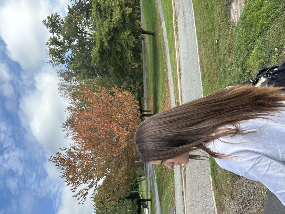 The image displays a female individual, seen from the upper back and right profile, standing outdoors in what appears to be a park or campus setting. She has long, straight, brown hair with lighter highlights and is wearing a white, long-sleeved shirt. A black bag is visible on her right side. Her gaze is directed towards the left side of the frame. The background consists of green grass interspersed with scattered fallen leaves. Multiple trees are visible, with one prominent tree in the mid-ground exhibiting vibrant orange and red autumn foliage. Other trees show varying shades of green and brown. Paved surfaces are present; a darker grey road or path runs horizontally in the foreground, and a lighter grey path curves through the mid-ground. A small, light-colored object, possibly a vehicle, is partially visible on the far-left paved area in the background. The sky is partially cloudy with blue patches and white cumulus clouds. A utility cover is visible on the grass in the lower right quadrant. The specific location within Wellesley, United States, cannot be identified from the visual data provided.
