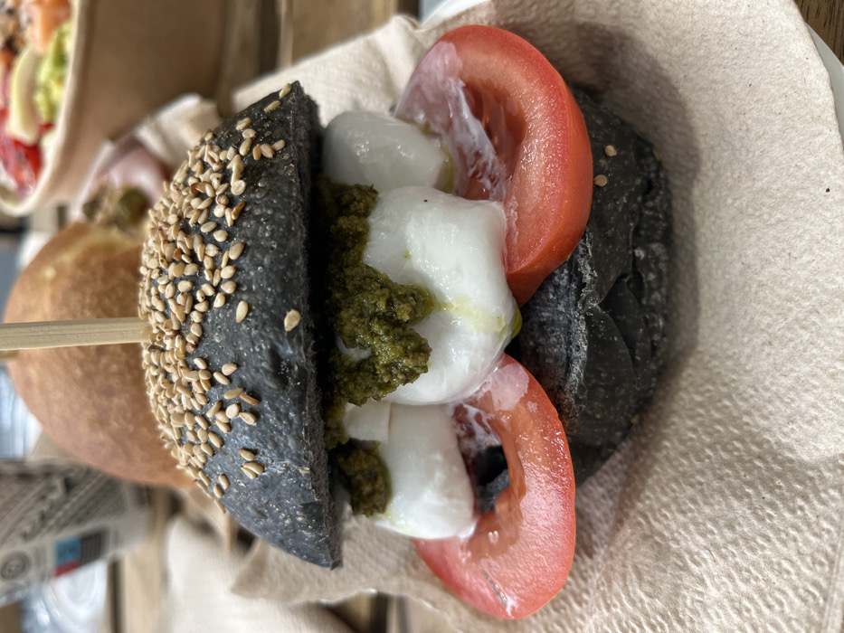The image displays a close-up, slightly elevated view of a prepared food item, a sandwich, positioned on a light brown, textured paper liner. The sandwich consists of a black, charcoal-infused bun, generously topped with sesame seeds, and held together by a slender, vertically inserted wooden skewer. The interior components, visible between the two bun halves, include multiple irregular white pieces of fresh mozzarella cheese, which are heavily drizzled with a vibrant green pesto sauce. Beneath the cheese and pesto, two distinct circular slices of red tomato are present, resting upon the bottom black bun. In the blurred background, additional food items are visible. To the left, a white paper cup with dark markings is partially discernible. Immediately behind the primary sandwich, another plain, light brown bun is present. Further to the right in the background, a brown paper bowl contains a colorful salad, showing segments of red, green, and lighter-toned ingredients. All items are situated on a light-colored wooden surface. No human individuals, direct actions, or interactions are observable within the frame. The precise location within the city of Bologna, Italy, is not identifiable from the visual content provided.
