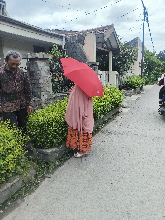 A woman in a pink hijab and orange patterned skirt holds a red umbrella obscuring her face. She stands on a paved street beside a low green hedge and a concrete curb. To her left, a man in a patterned shirt stands by a stone fence. Buildings are visible in the background. A motorbike passes in the distance on the right. The sky is overcast.