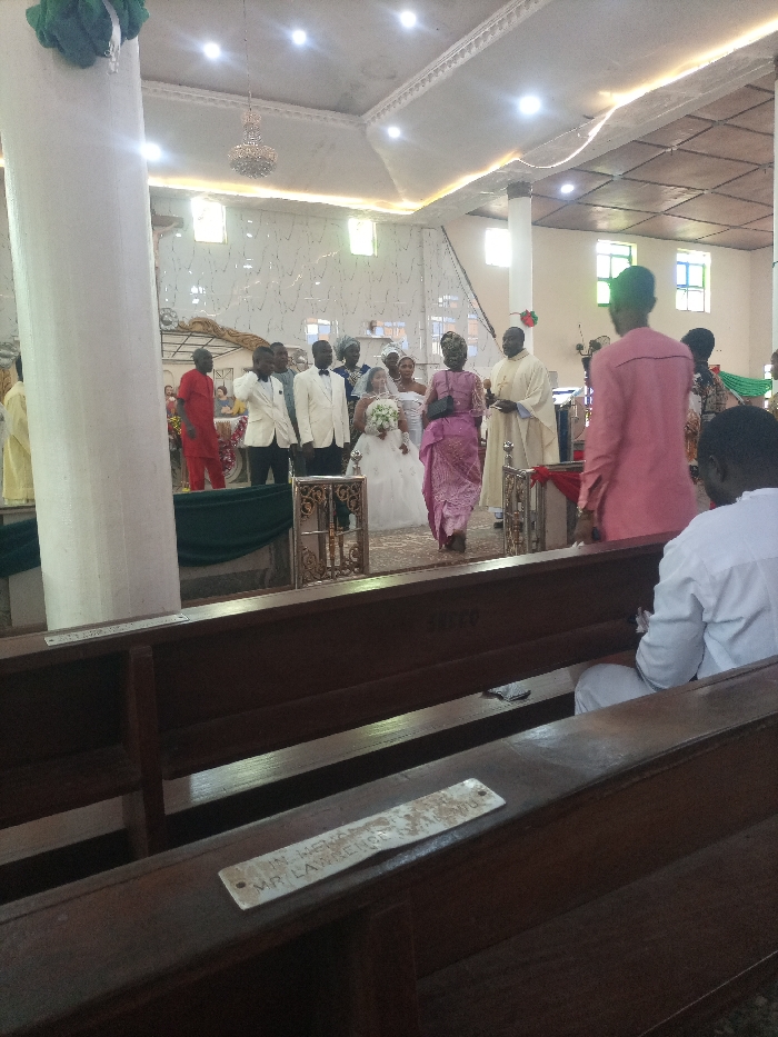 A wedding ceremony is depicted inside a church, located in the city of Evuazu, Nigeria