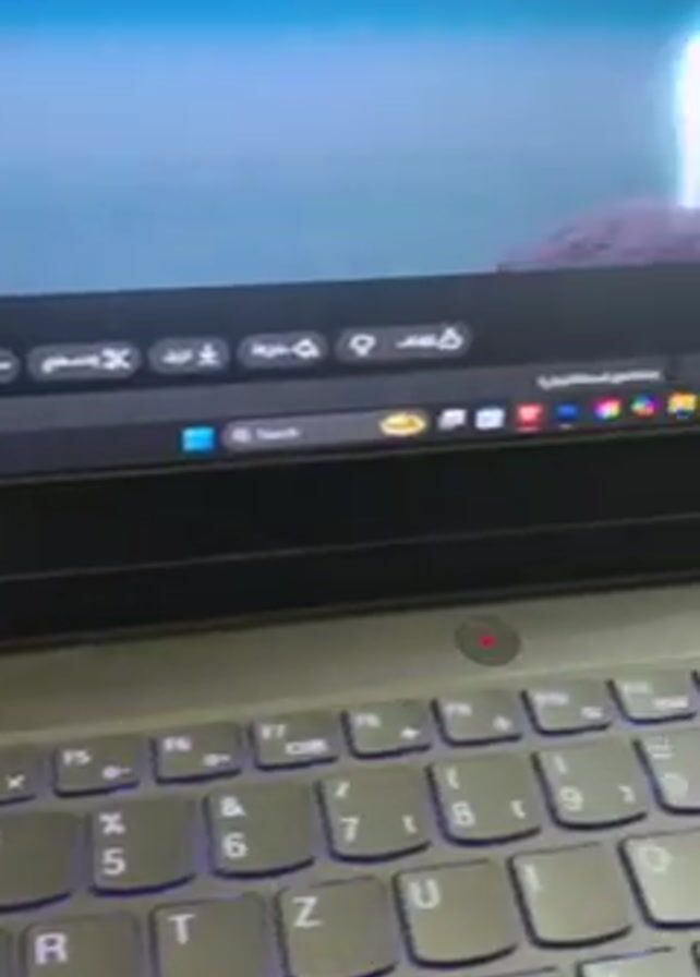 person sitting at a desk. The person is wearing a black t-shirt, and has dark hair. The person is using a laptop computer with the screen visible. A video appears to be playing on the screen. The keyboard of the laptop is visible and has a purple backlight. The desk appears to be white, with a marble pattern. A gaming chair is visible behind the person. The person touches their face and looks down at the laptop screen.