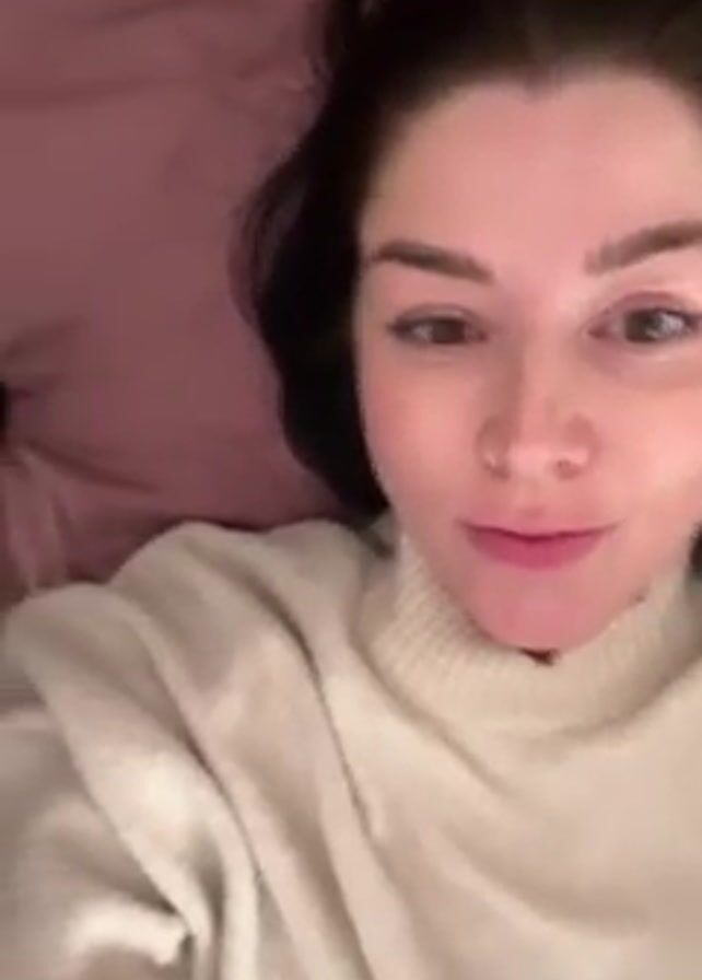 A young woman with dark hair is lying on her back on a pink bedspread, wearing a light-colored turtleneck sweater