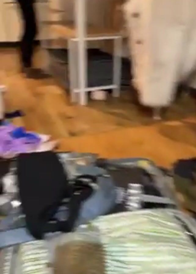 very messy room. There are several open suitcases scattered across the wooden floor. Clothes and personal belongings are strewn around the suitcases, covering a large portion of the room. The room appears to be a bedroom or storage area, with walls painted in a light color. A blue suitcase stands upright in one corner, and another striped suitcase leans against a wall in the background. The overall impression is one of clutter and disarray.