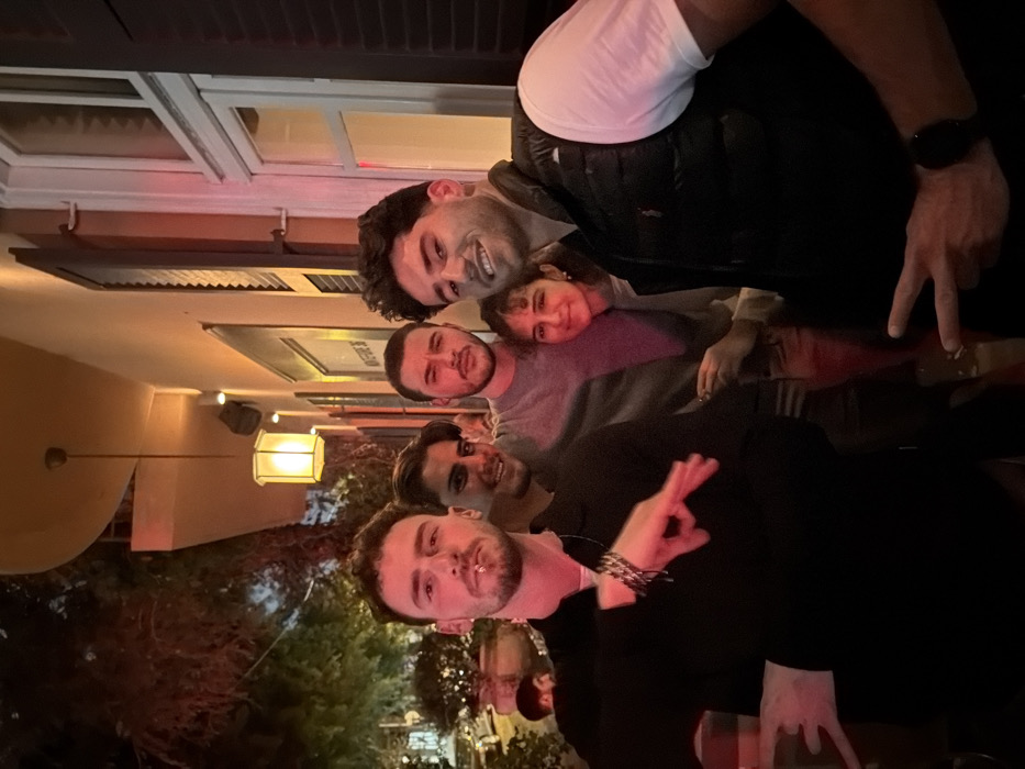 A group of five people poses for a selfie outdoors at night. Four men and one young girl are visible. The men are casually dressed, some in sweaters and one in a vest. A man in the foreground makes an "OK" hand gesture. Another man in the background gives a peace sign. Streetlights and building features are visible, suggesting an urban setting.