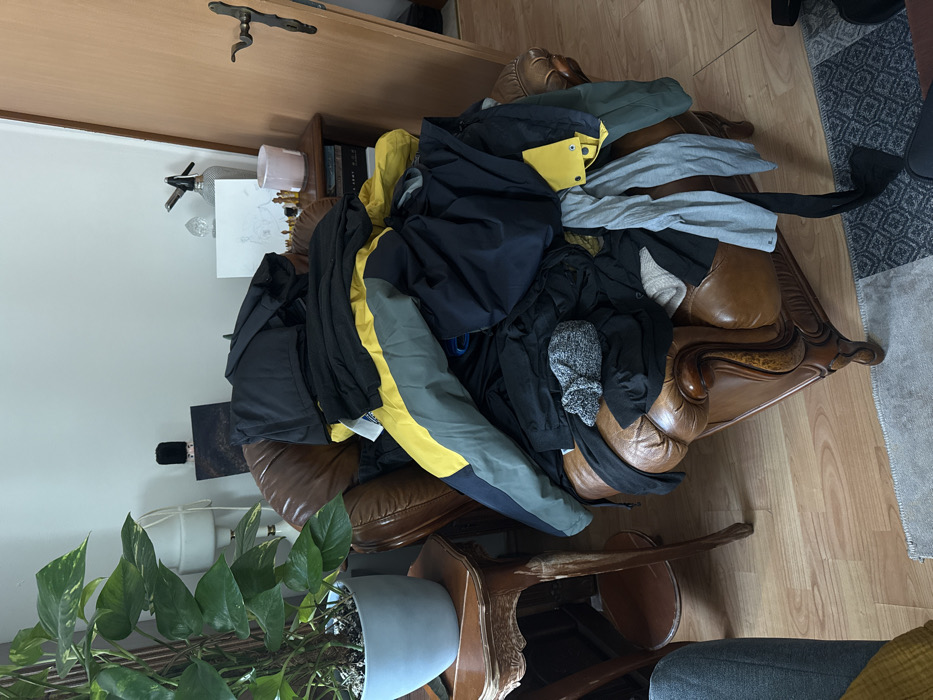This image depicts an indoor domestic scene located in Hainburg an der Donau, Austria. The central focus is a large, brown, tufted leather armchair, heavily laden with a disorganized pile of various clothing items. This pile includes a prominent multi-colored jacket in yellow, green, and black, several dark-colored jackets or hoodies, a grey knitted garment, and other assorted light and dark fabrics. To the left of the armchair, an ornate dark wood side table supports a light grey plant pot containing a large, leafy green plant with variegated foliage. A second, darker wood side table stands behind the armchair against a plain light-colored wall. This table holds a dark framed picture, a smartphone in a stand, a white drawing on what appears to be a small easel, a clear glass seltzer bottle with a pump mechanism, a light pink candle in a holder, and a small collection of chess pieces. Below these items, several books or media cases are stacked. To the right, a light brown wooden door with an antique-style dark metal handle is partially ajar, revealing a dark space beyond. The floor throughout the visible area is light-colored wood laminate or parquet, with a grey rug featuring a geometric pattern partially visible in the lower right foreground. No individuals are present, and no overt activity is depicted.