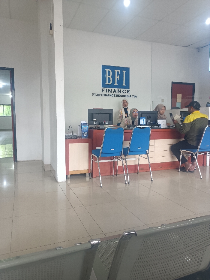 The image displays the interior of a BFI Finance branch office, identified by the prominent blue "BFI FINANCE PT