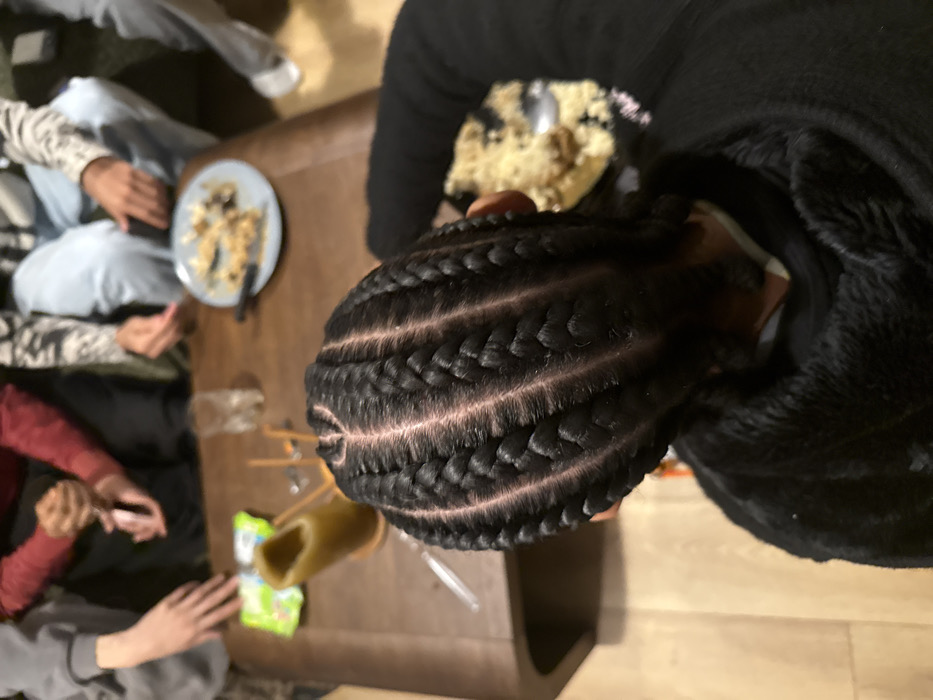 The scene is specified as occurring in Saint-Denis, France, within an indoor domestic environment featuring a light-colored wooden floor. The image is captured from an overhead perspective, focusing on the back of a person's head and a table surrounded by individuals. The primary subject in the foreground displays five prominent cornrows braided from front to back with distinct scalp partings, including a small 'V'-shaped parting at the crown. This individual is wearing a dark, possibly black, hooded garment with a visible texture. To the right of this person, a black plate or shallow bowl contains light-colored, granular food with darker elements, and a silver spoon rests within it. The midground features a dark, glossy wooden coffee table. On the table, a light blue plate holds a partially consumed portion of a light-colored, granular food dish with darker inclusions, accompanied by a dark-handled knife. Adjacent to this, a clear drinking glass is present. Further left on the table, a large, cylindrical, light brown candle stands upright, next to a small green package, and several thin brown stick-like objects. In the blurred background, three other individuals are partially visible, seated around the table. Their faces are obscured. One person on the left wears a grey long-sleeved top, another in the center-left wears a red long-sleeved top and dark trousers, holding a small pink object. A third person on the center-right wears a patterned long-sleeved top and light blue jeans, with their hands resting near the blue plate. The general activity implies a casual social gathering.