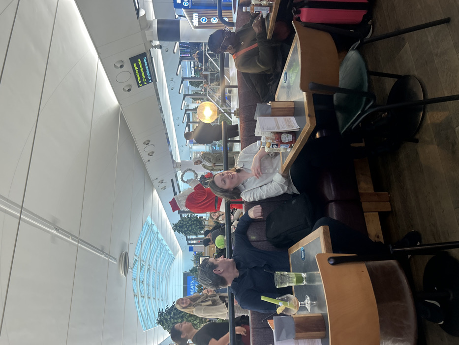 The image displays an indoor scene within a casual dining establishment located in Gatwick Airport, Crawley, United Kingdom. The restaurant area, identified by a "KING OF TRAIN" sign in the background, is part of a larger airport terminal concourse. In the foreground, a man with short, dark hair, wearing a dark blue collared shirt, is seated on a brown upholstered booth bench. He is turned to his right, looking towards an individual off-camera. A black laptop bag rests on the bench beside him. To his right, a woman with shoulder-length dark hair, dressed in a light-colored, long-sleeved shirt, is seated on the same bench. She is smiling and gesturing with her hands, appearing to engage in conversation. On the dark-surfaced tables in front of them are beverages, including a cocktail with a celery stick and a glass containing a green liquid, along with condiment bottles (ketchup, mustard) and a menu holder. In the midground, beyond the seating area, a person dressed as Santa Claus is standing, wearing a red suit, hat, and white beard, holding a green wreath. Several other individuals are visible in the background: a woman in a beige headscarf standing near Santa, a man in a dark suit further back, and a woman with dark skin wearing an olive-green top and an orange cross-body bag, seated at a table on the far right. A pink rolling suitcase is positioned next to her table. The environment features a high, white paneled ceiling with visible architectural beams and skylight-like structures. Overhead signs indicate "Departure gates," "Airline Information," and "Additional seating." An "ATM" sign is also visible. Potted plants are strategically placed throughout the open-plan area. The space is well-lit, characteristic of a modern airport terminal.