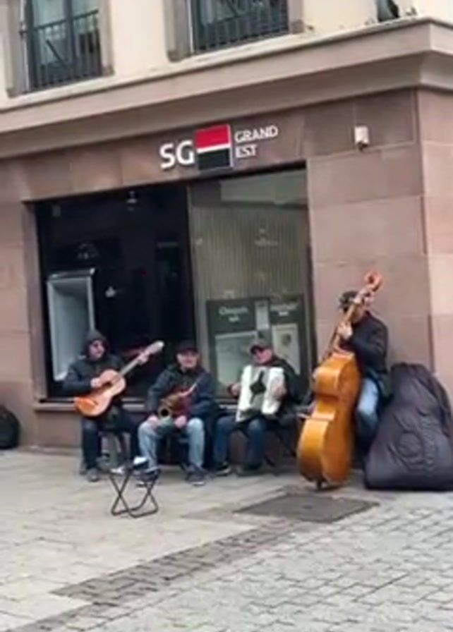 four-member band playing on a city sidewalk in front of a bank building. The band consists of a guitarist on the left, a saxophone player next to him, an accordionist, and a stand-up bass player on the right. All the musicians are male and are seated while playing. A black bag is leaning against the bass. Pedestrians walk by on the sidewalk, including a woman with gray hair and glasses, who is the closest person to the camera. The bank building has the logo "SG GRAND EST". The sidewalk is brick, and the building is made of stone. There is a small table in front of the guitar player.