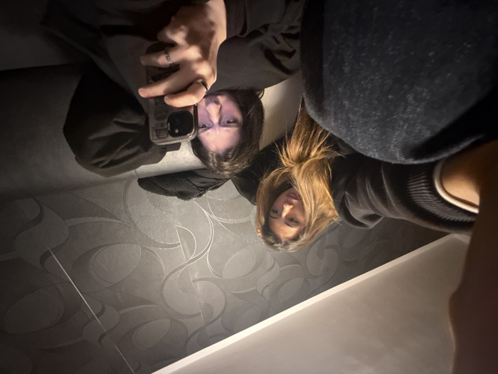 A reflective selfie shows two individuals, seemingly in a bathroom