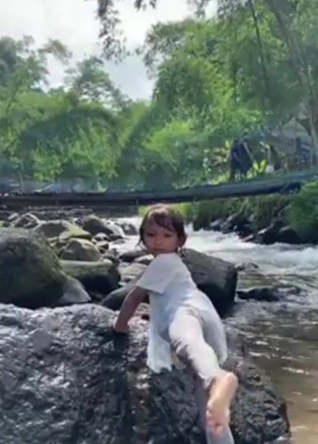 A little girl, barefoot, in light-colored clothing, climbs on a large, dark rock in a shallow, fast-flowing river. The water is clear, and other rocks of varying sizes dot the riverbed. Lush green trees and bamboo line the banks of the river, creating a dense, natural canopy overhead. In the background, a simple bridge constructed from bamboo and blue tarps spans the river, with people walking on it. The lighting is bright, indicating daytime.