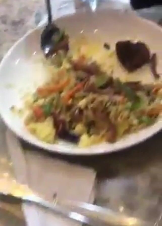 table setting in a restaurant. The tabletop is granite-patterned. Two plates of rice mixed with vegetables and a piece of meat are visible. Each plate has a bowl of sauce beside it. Two water bottles sit next to the plates. A cell phone is also on the table. A person wearing a patterned sweater uses a spoon to eat the rice on one of the plates. The environment suggests a casual dining setting.