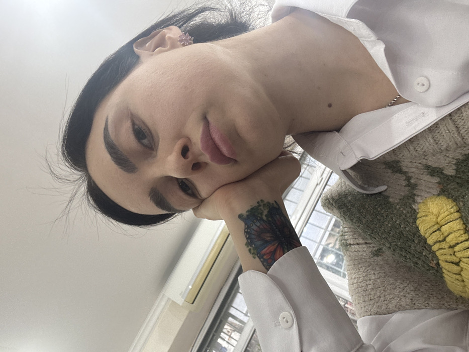 The image presents a low-angle, close-up view of a young adult female indoors. She has dark hair, dark eyebrows, and a fair complexion. Her left hand supports her jaw, prominently displaying a colorful butterfly tattoo on her inner left wrist, featuring shades of blue, red, orange, and green. She is dressed in a white collared shirt layered under a light-colored, possibly knitted, garment with green and yellow design elements, appearing to be a floral pattern. A small, pink, flower-shaped earring is visible on her right earlobe, and a thin silver-colored chain rests around her neck. Her gaze is directed towards the camera with a neutral to slightly contemplative expression. The background features a light-colored ceiling and a white wall-mounted air conditioning unit positioned on the upper left. Below the unit, a window reveals a blurred, unidentifiable outdoor environment. Based solely on the visual information provided, a specific location within Tbilisi, Georgia, cannot be determined.
