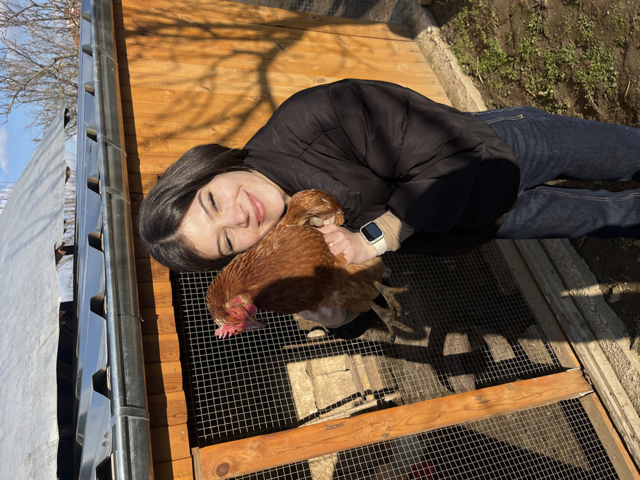 A young female, estimated to be in her late teens or early twenties with short dark hair, is standing outdoors in Dve Mogili, Bulgaria. She is smiling and looking towards the right, holding a brown chicken with a distinct red comb and wattle against her chest with both hands. She is dressed in a black puffer jacket, a tan long-sleeved shirt, dark blue jeans, and a light-colored smartwatch is visible on her left wrist. Behind her is a wooden chicken coop or enclosure featuring a metal mesh front panel, a wooden door on the left, and a corrugated metal roof with a functional gutter system. Strong sunlight from the upper right casts prominent shadows of bare tree branches onto the wooden structure and also casts a shadow from the subject onto the foreground. The ground consists of dirt with sparse green vegetation, and a concrete-like foundation runs along the base of the coop. The background reveals bare tree branches against a clear blue sky with minimal cloud cover.