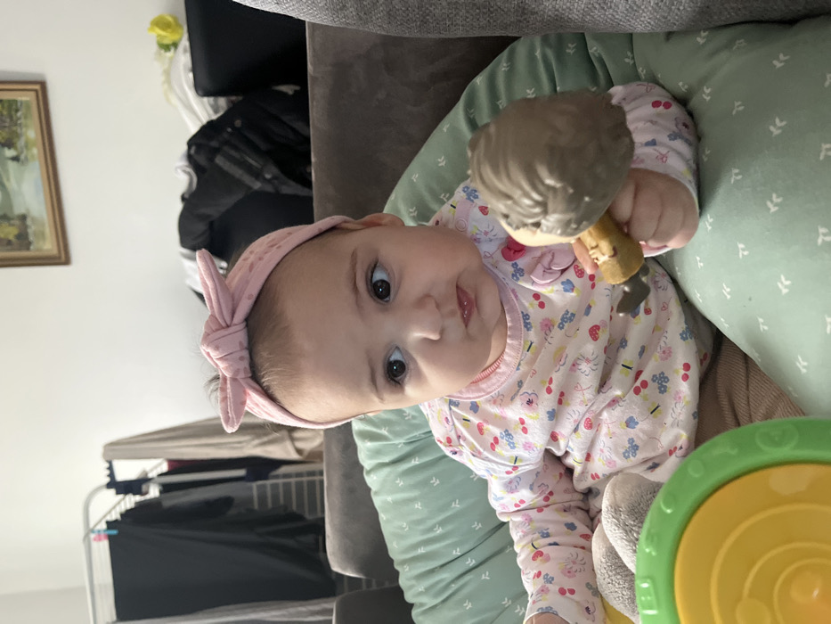 - "A single infant is seated in a light green support cushion with a white leaf pattern, positioned on a grey upholstered sofa within a private residence in Strasbourg, France" by FM-o1TYQ2, licensed under CC BY 4.0