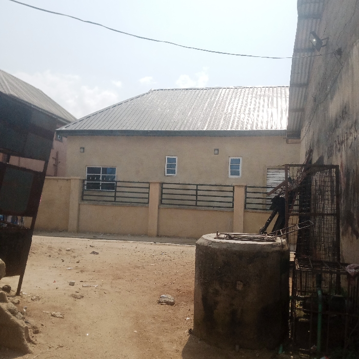 The image depicts an unpaved, dusty thoroughfare in Ikorodu, Nigeria, under a bright, clear sky. In the foreground, a weathered concrete well-head, approximately 1 meter high, stands centrally. To its immediate right, a collection of rusted metal structures, possibly shelving or cages, leans against a tall, unpainted concrete wall with some dark staining and faded markings. On the far left, a dark, partially obscured structure, possibly a kiosk frame or shed, is visible. In the midground, beyond the unpaved path and a low, light tan perimeter wall with black horizontal metal railings, stands a single-story building. This building features a light beige/tan facade, a dark gray corrugated metal roof, one large horizontally oriented window with dark frames, and two smaller vertically oriented windows with white frames and light-tinted glass. No individuals or active interactions are observed.