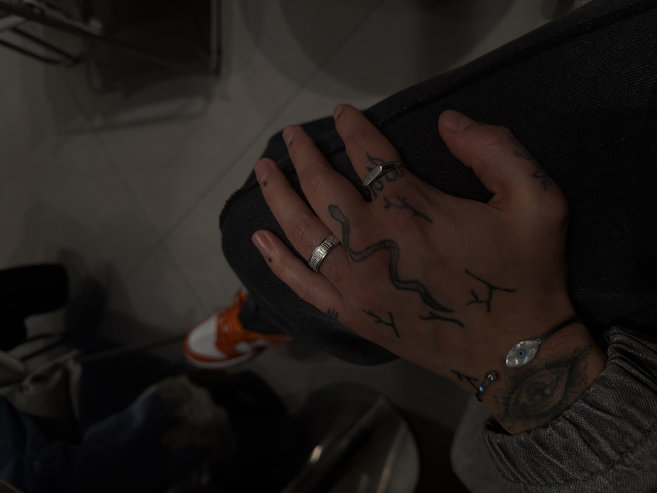 A close-up shows a tattooed hand adorned with two rings and a bracelet, resting on a denim-clad lap. The tattoos feature a snake, an eye, and abstract symbols. The rings are silver, one a simple band and the other with a textured design. The bracelet is a thin cord with an eye-shaped charm. An orange and white sneaker peeks from the lower left, adding a pop of color to the muted tones of the image.