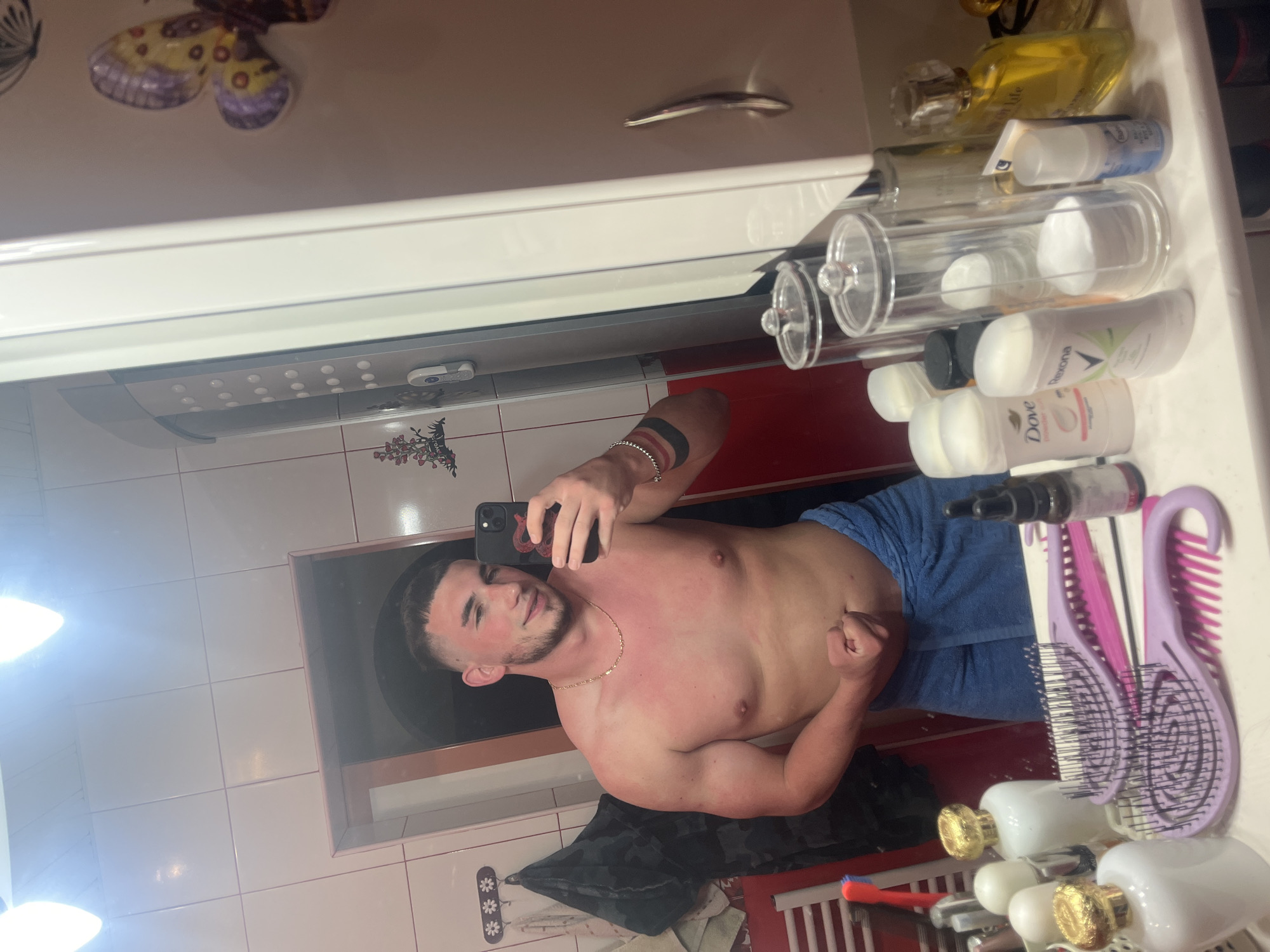 A shirtless man wearing a gold chain and a blue towel around his waist is taking a selfie in a bathroom mirror. He is flexing his right arm. The bathroom has white tiled walls with red and white tile accents. A butterfly sticker is visible on the ceiling. A variety of toiletries are arranged on the countertop in front of the mirror, including deodorant, cotton pads in clear containers, a bottle of perfume, and hairbrushes. The location is likely a private residence. There is no information to confirm this picture was taken in Veliko Tarnovo, Bulgaria.