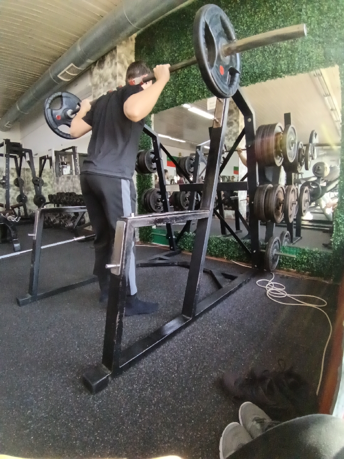 This image depicts an interior view of a gym located in Cherven Bryag, Bulgaria. In the foreground, a male individual, seen from behind, is performing a barbell squat. He is wearing a black short-sleeved t-shirt, black and grey athletic pants, and black socks, with a red and white headband visible on his head. A metal barbell, loaded with a black weight plate on each side (the right plate showing a red center), rests across his upper back within a black metal squat rack. The gym floor is covered with black rubberized matting. The background features a wall partially covered with artificial green foliage (hedging), which also lines the base of a large mirror. This mirror reflects the gym's interior, showing additional weightlifting equipment, including dumbbell racks, and a Bulgarian flag (horizontal white, green, and red stripes) mounted on a wall. Above, a corrugated metal ceiling with a large grey ventilation duct is visible. Stored weight plates are mounted on pins on the right side of the squat rack structure. A coiled white rope and a pair of black athletic shoes are on the floor near the mirror. In the immediate bottom right foreground, the feet of another individual, wearing grey sneakers and dark pants, are partially visible, indicating a perspective from floor level.