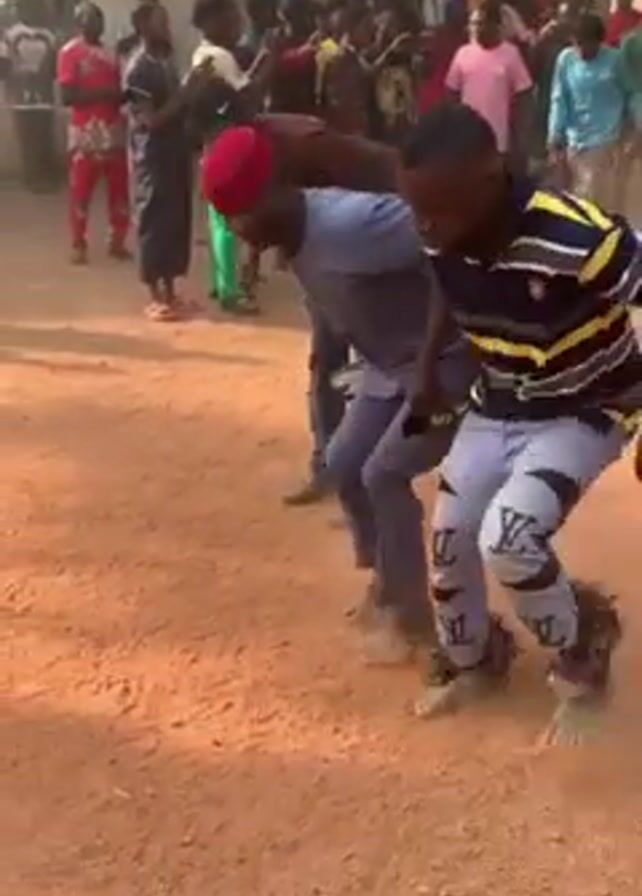 A medium shot of a group of men dancing in a dusty area outside