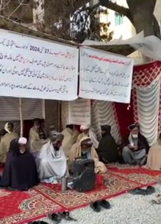 group of men gathered outdoors, sitting on a red patterned rug under a makeshift shelter. Most of the men appear to be elderly, and many are wearing traditional clothing and headwear. There are several pairs of shoes lined up at the edge of the rug. Behind the men, two large signs written in a language other than English are visible, supported by poles. A small speaker sits on the rug near the front of the group. The background includes buildings and a tree, suggesting the gathering is taking place in a town or city. The atmosphere appears calm and deliberate, possibly indicating a meeting or discussion of some kind.