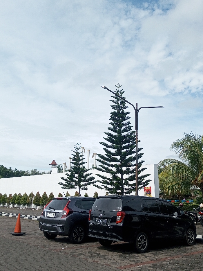 Two cars, one grey and one black, are parked in a paved lot in front of a tall white wall. Several small green shrubs line the wall's base. Two tall, pointed evergreen trees stand behind the cars, flanking a light pole. Part of a building with a small tower is visible behind the wall. An orange traffic cone sits to the left of the grey car. The sky is overcast with scattered clouds.