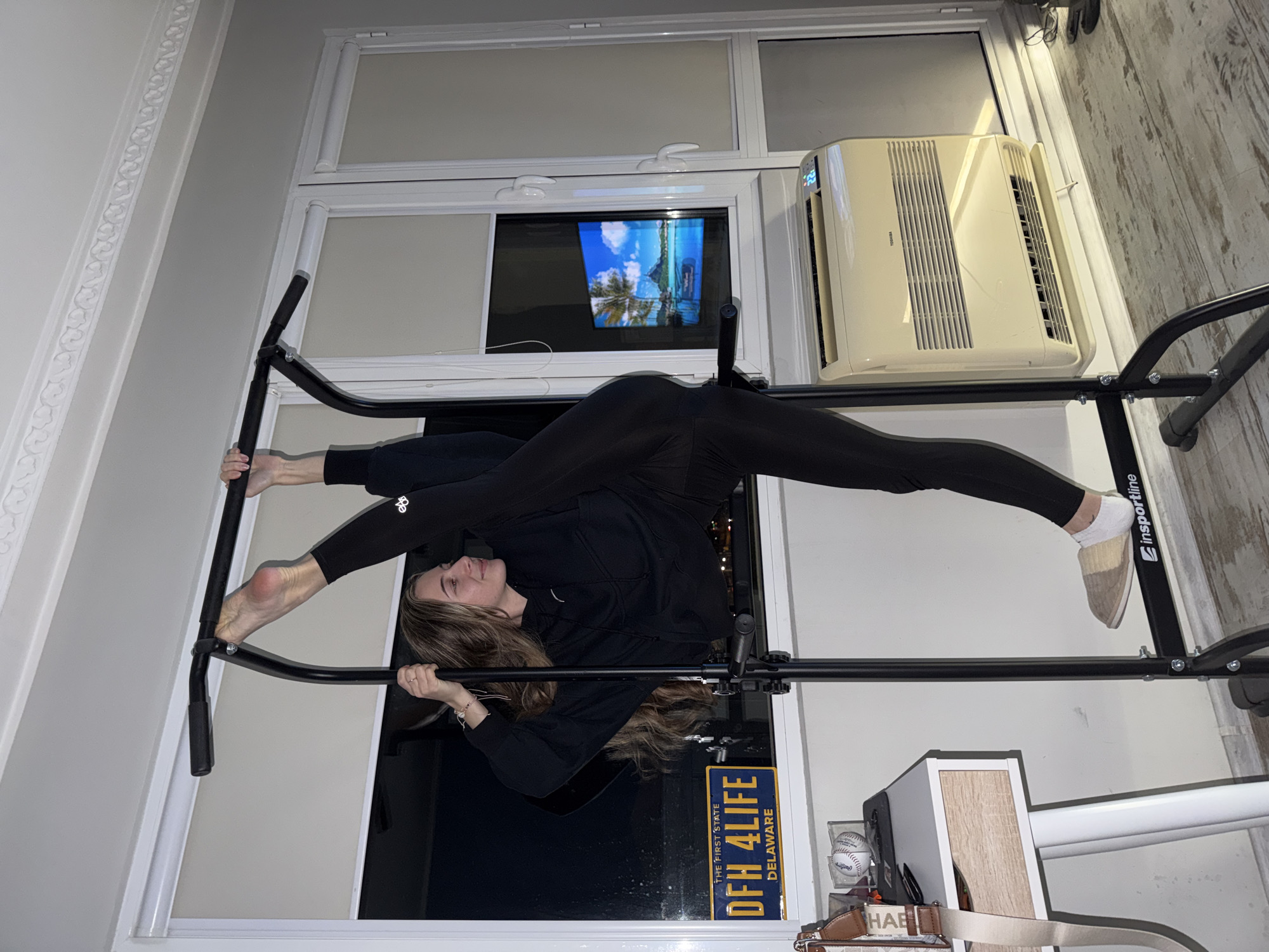 A woman in black athletic wear is performing a split on a pull-up bar. One leg is extended to the left and the other is extended to the right. She is holding onto the bar with her hands. The bar is positioned within a window frame. An air conditioner is visible next to the window. A license plate that reads "DFH 4 LIFE DELAWARE" is placed on the ledge of the window. The location is not Plovdiv, Bulgaria.