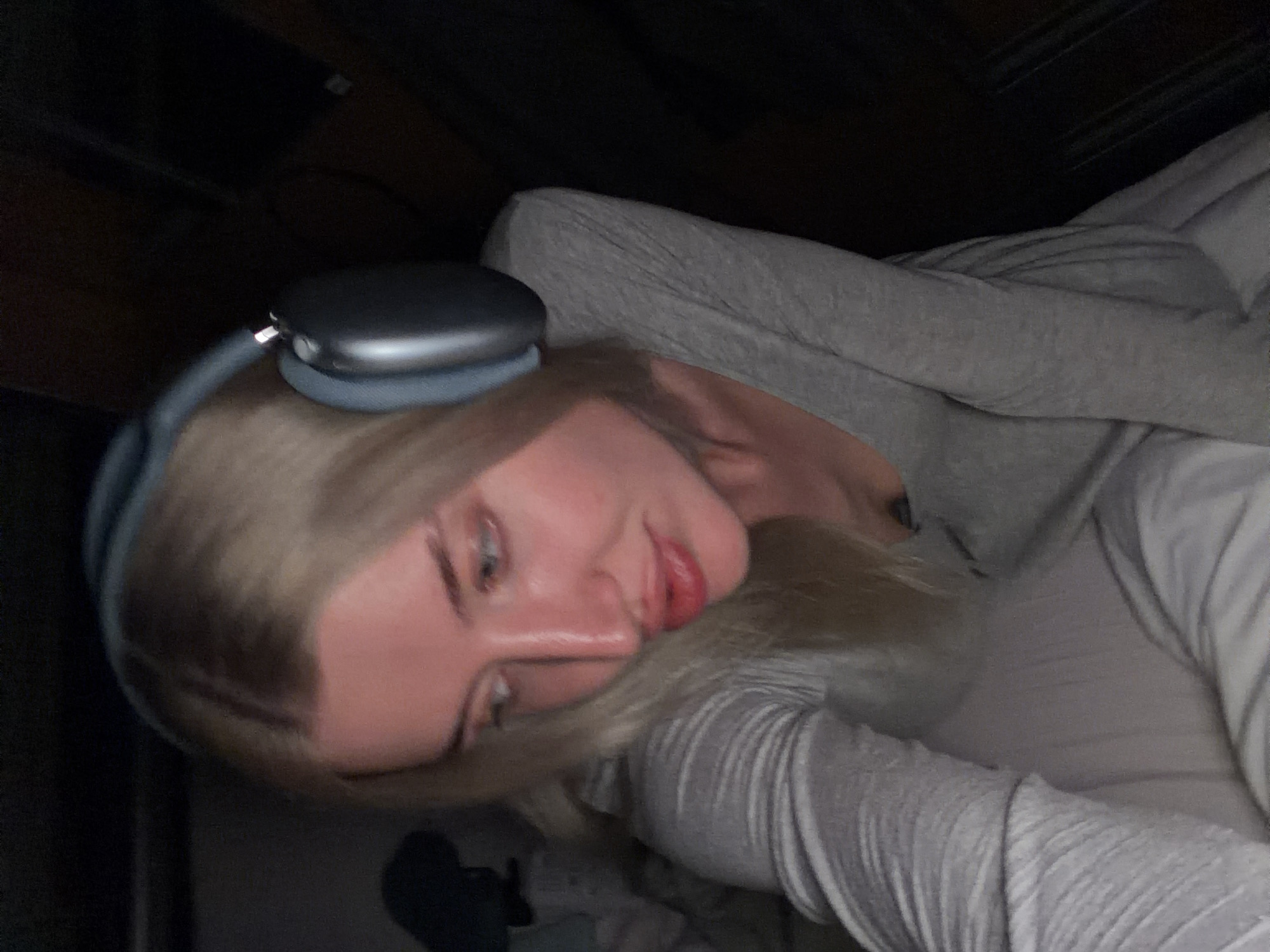 The image presents a young blonde female situated in a low-light indoor setting within the city of Boljevići, Montenegro. Her fair skin is partially illuminated by an unseen light source. She wears light blue-grey over-ear headphones, specifically identifiable as AirPods Max, resting over her long, straight blonde hair which is parted centrally. Her attire includes a light grey, long-sleeved garment, possibly a top, with a darker garment visible underneath the neckline. Her head is tilted downwards and to her left, with her eyes directed away from the camera. Her lips are slightly parted, exhibiting a reddish tint. The subject appears to be seated or reclining on a light-colored surface, likely bedding. The background is dark and out of focus, showing only indistinct shapes, including a darker vertical surface on the right. No other individuals are present.