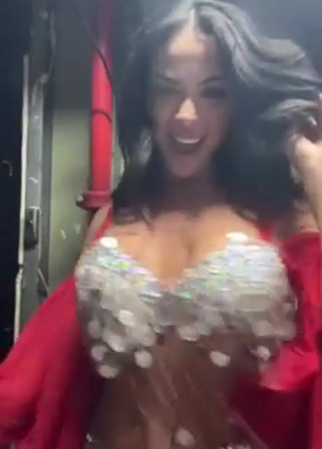 A woman in a silver and red belly dancing outfit is seen from the chest up, indoors in an unadorned, utility-looking space. She has long dark hair. She smiles and dances, then makes a heart shape with her hands and returns to dancing. Wires and pipes are visible around her.