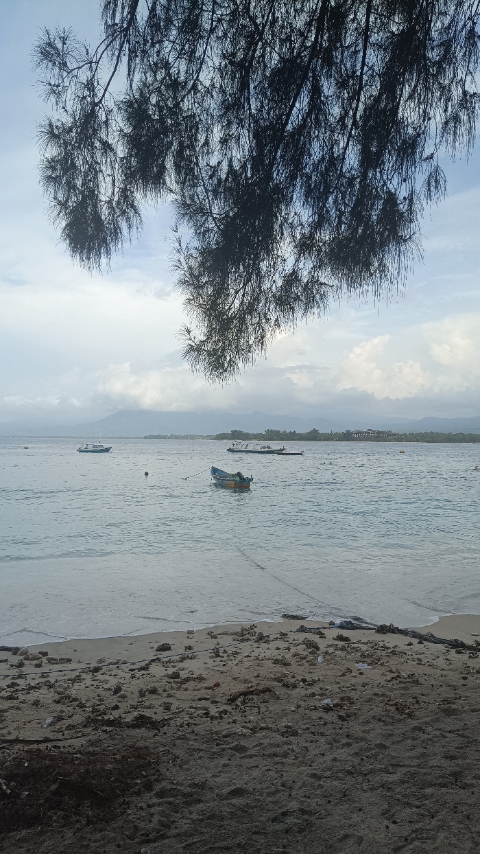 A coastal scene showcases a sandy beach in the foreground, littered with debris. Calm, reflective water stretches towards a distant landmass under a cloudy sky. Several boats dot the sea, with one prominently anchored in the middle. Overhanging branches from a large tree dominate the top of the frame, creating a shadowed canopy. The overall mood is tranquil, yet slightly marred by the litter on the beach.
