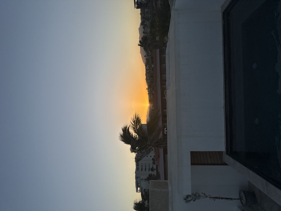The image presents an elevated, static view of San José del Cabo, Mexico, captured during either sunrise or sunset. In the immediate foreground, a dark-tiled, rectangular plunge pool with light-colored coping is situated on a rooftop patio. Adjacent to the pool on the left, a white-painted concrete structure incorporates a vertical wooden slatted door and a small potted plant. The midground features several palm trees with fronds appearing to be wind-blown, set against a backdrop of various light-colored buildings, one of which is a multi-story structure on the left with visible exposed rebar on its upper level, suggesting ongoing construction or an unfinished state. A reddish-brown rooftop is visible below these structures. The horizon is dominated by a brilliant orange and yellow sun, positioned centrally, which casts a bright glow and silhouettes distant mountain ranges and hills. The sky transitions from intense orange and yellow near the horizon to a clear, pale blue at the top of the frame. No individuals, animals, or active subjects are present in the scene.