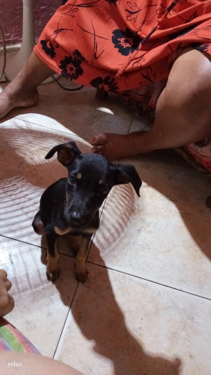 - "A small, black and tan puppy sits on a tiled floor looking up at the camera" by FM-LkkdS2, licensed under CC BY 4.0