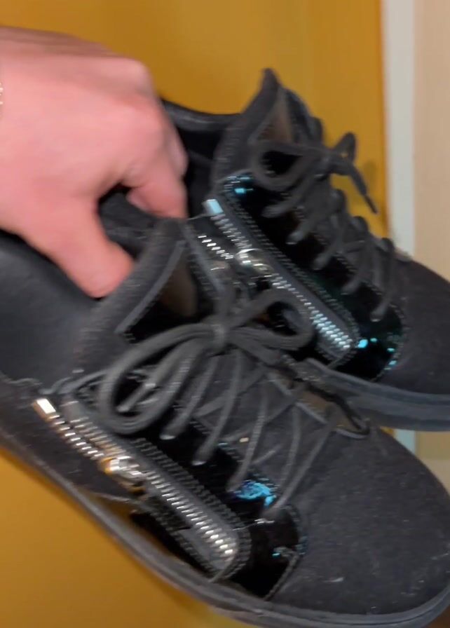 A hand wearing a gold bracelet is shown holding a pair of black sneakers