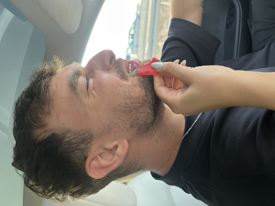 A male individual with dark, wavy hair and stubble is depicted from the right side, seated in the driver's position of a vehicle in Kfar Qasim, Israel. He wears a black t-shirt and a silver chain. His right eye is squinted, and his mouth is open with his tongue extended, displaying green residue. A female's right hand, with light blue manicured nails, holds a red, sugar-coated, chili-pepper-shaped gummy candy with a green stem, which is partially inserted into the male's mouth. The vehicle interior features a light-colored headliner and dark accents. Through the window, an exterior view of an asphalt road, a guardrail, and blurred vehicles in the distance is visible under daylight conditions.