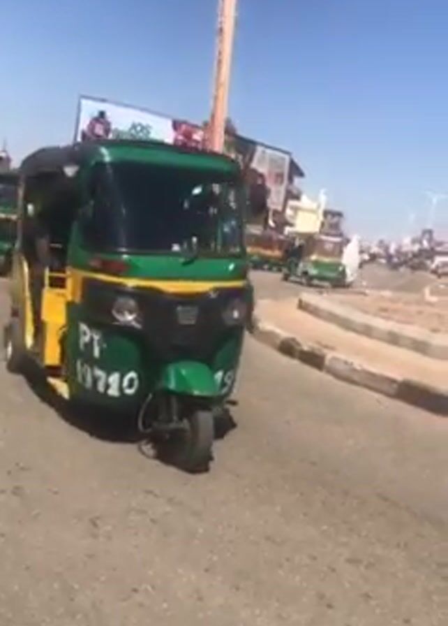 The video depicts a sunny day on a road lined with green and yellow auto rickshaws, known as "keke" in some regions