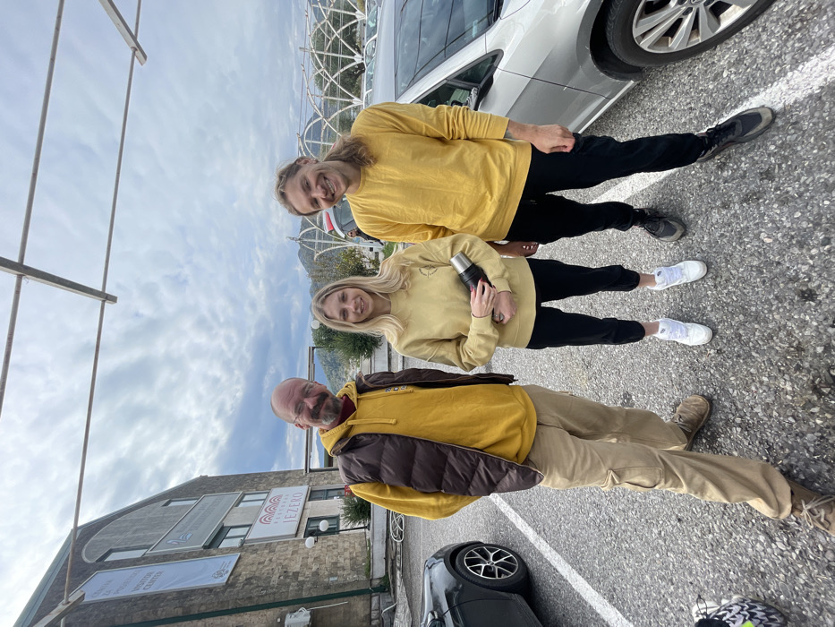 A group photograph captures three individuals – two males and one female – standing in a paved parking lot in front of the Lake Skadar National Park Visitor Center and Restoran Jezero in Vranjina, Montenegro. From left to right: A male subject with a beard and eyeglasses wears a yellow hooded sweatshirt, a brown puffer vest, khaki cargo pants, and brown lace-up shoes. He faces forward, smiling. Next to him, a female subject with blonde hair wears a light yellow long-sleeved top, black pants, and white sneakers. She holds a dark-colored insulated bottle with both hands at waist height and smiles at the camera. The third subject, a male with long blonde hair, stands to the right, wearing a yellow long-sleeved top, black pants, and dark sneakers. He also faces forward, smiling. The ground is asphalt with visible white parking lines. A dark-colored car is partially visible on the far left, and a silver car on the far right. Above the subjects, a metal grid-like structure is present. The background features a multi-story building constructed of stone, identified by banners as "CENTAR ZA POSJETIOCE / VISITOR CENTER" and "RESTORAN JEZERO." Beyond the building and subjects, distant mountains are visible under an overcast sky with scattered clouds.