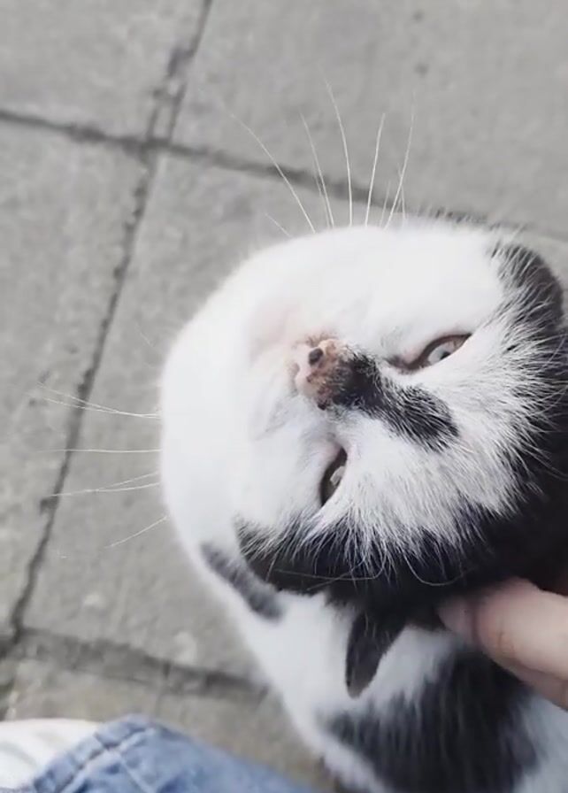 person petting a black and white cat. The cat is lying upside down with its head in the person’s hand. The person’s other hand pets the cat’s back. The cat meows. The background is a gray concrete surface and blue jeans.