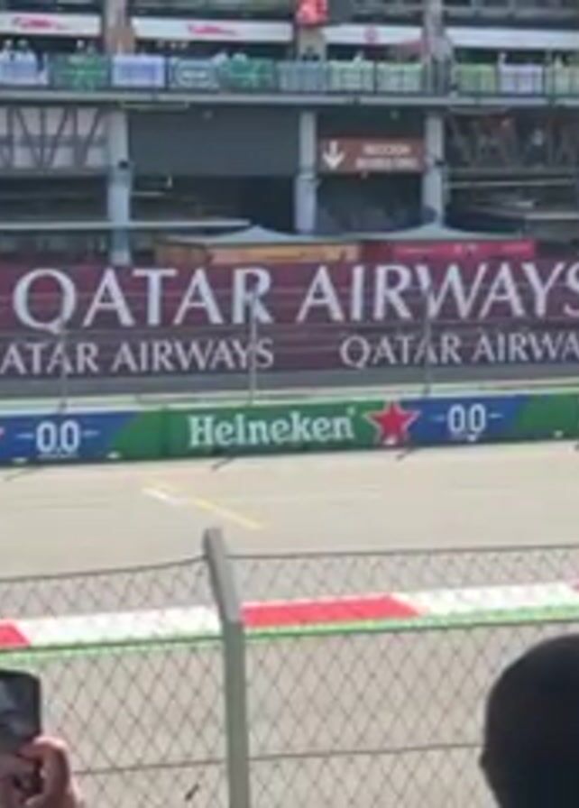 race track with spectators watching from behind a fence. A race car speeds down the track. Banners for Qatar Airways and Heineken are visible along the track barrier. The grandstands are visible in the background. Some spectators are recording with their phones.